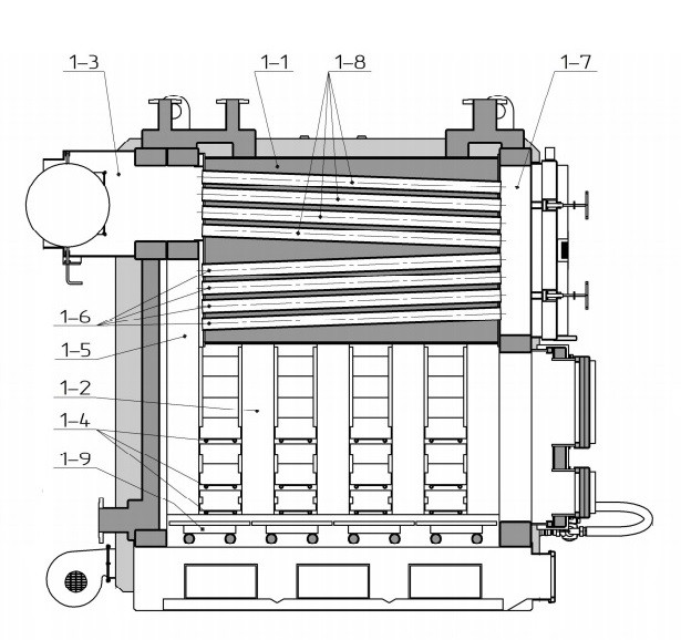 | 1-5. Перша поворотна камера теплообмінника; | 1-9. Колосникова решітка. |