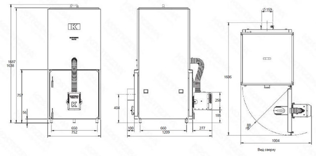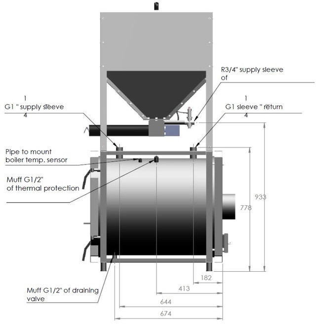 Компактний дизайн завдяки розташуванню бункера для палива над котлом.